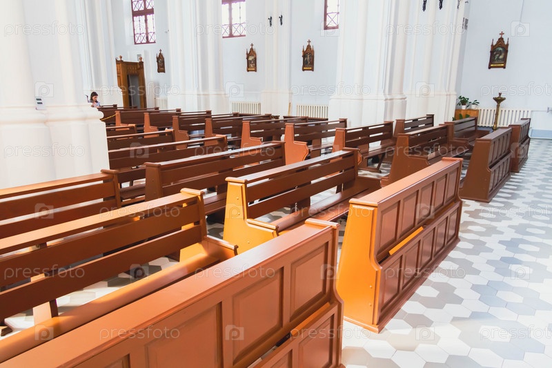 Люди молятся в церкви. Церковный приход. Верующие сидят на скамейках в зале