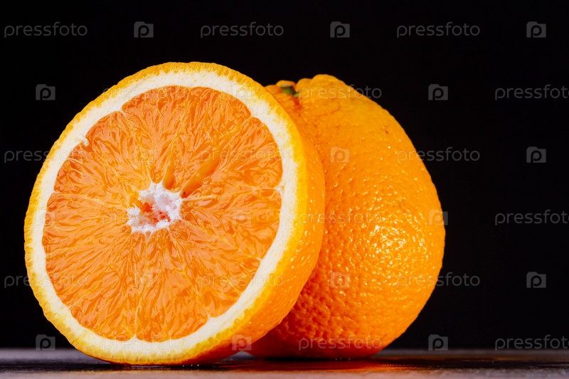 Половина апельсина. Две половинки фруктов на деревянном столе. Копипространство