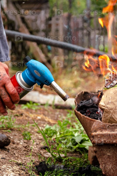 Розжиг с помощью горелки. Мужчина поджигает дрова газовой горелкой