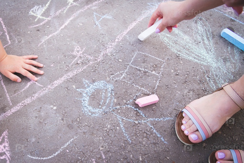 Дети рисуют мелом на дороге. Детское творчество на улице
