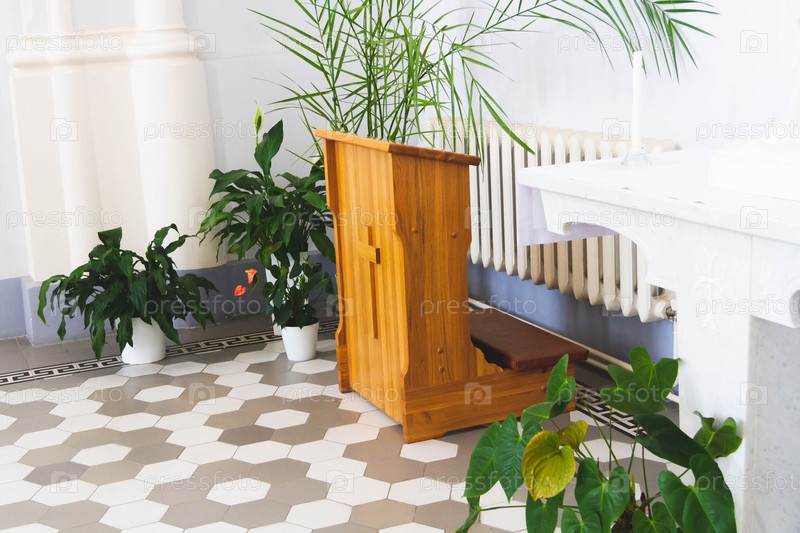 Внутри храма. Церковная атрибутика. Библия в церкви. Место для молитвы
