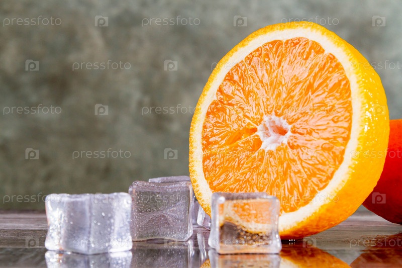 Апельсин и лед. Свежевыжатый ледяной сок. Фруктовая свежесть апельсина