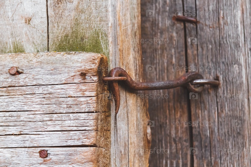 Старый болт. Винтажный замок. Дверь на крючке. Старый деревянный забор