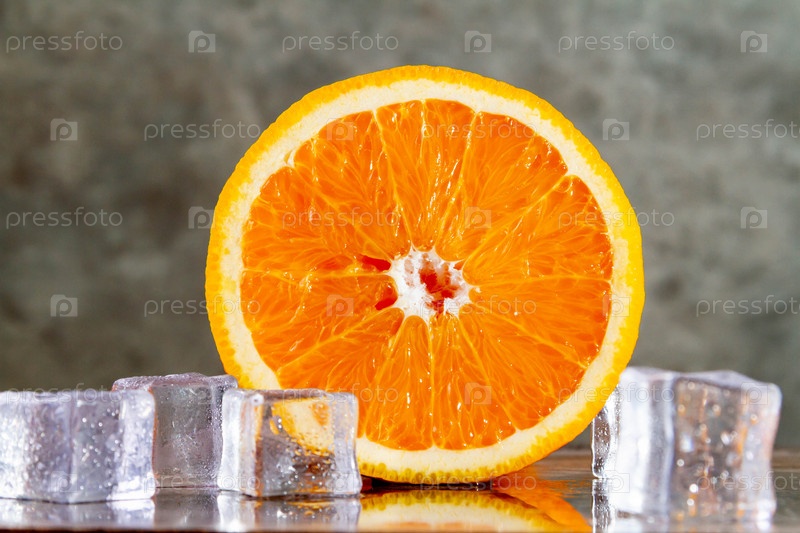 Апельсин и лед. Свежевыжатый ледяной сок. Фруктовая свежесть апельсина