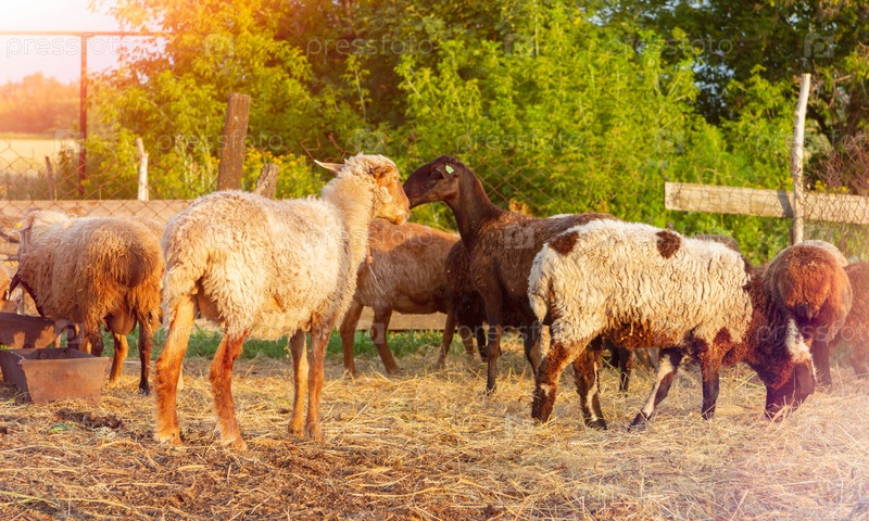 Стадо овец в загоне. Овечье пастбище. Скот в сарае