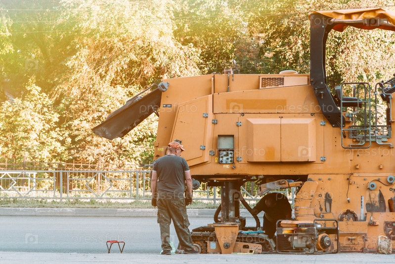 Дорожные работы. Рабочие ремонтируют асфальтовое покрытие дороги