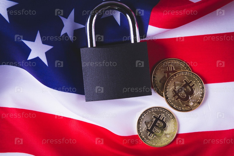 Биткойны в США. Запрет криптовалюты в Америке. Флаг США и биткойн-монета