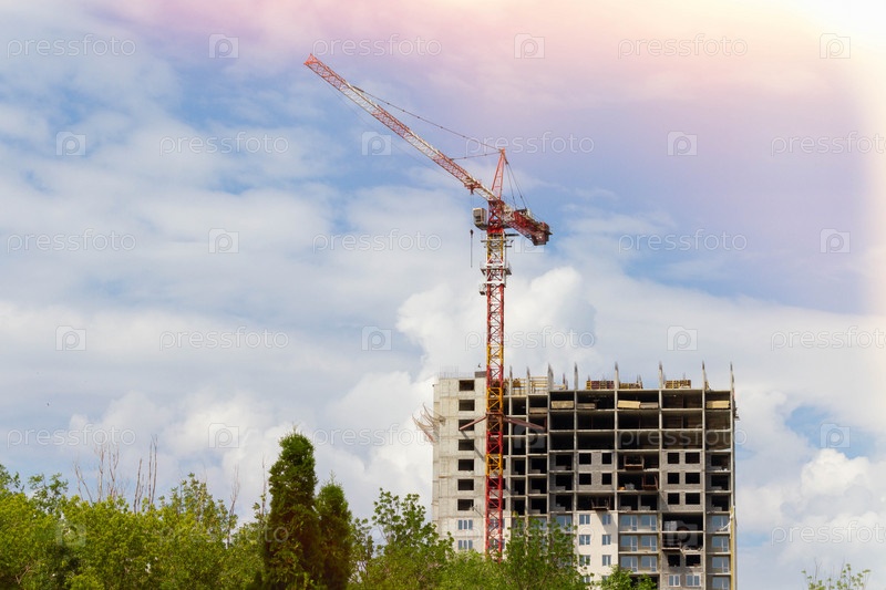 Строительный кран в лучах яркого солнца. Строящийся дом и кран