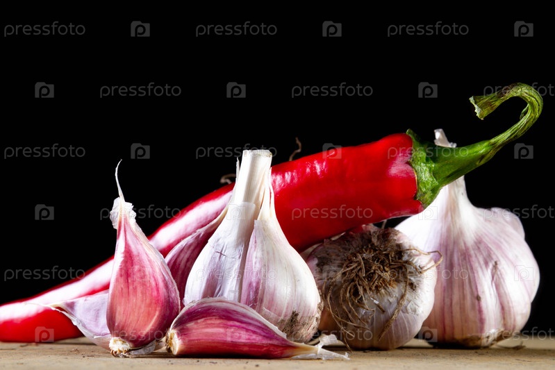 Чеснок и перец. Пряные специи. Горячий красный перец. Натуральные специи
