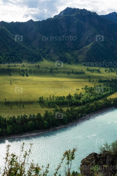Прекрасный вид на горную реку Катунь и зеленую долину