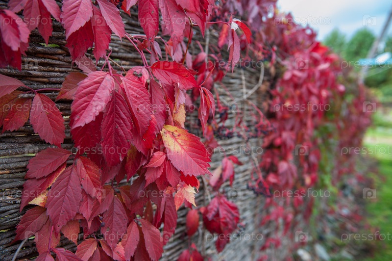 Красочные красные листья вирджинской лианы (Parthenocissus quinquefolia) на заборе
