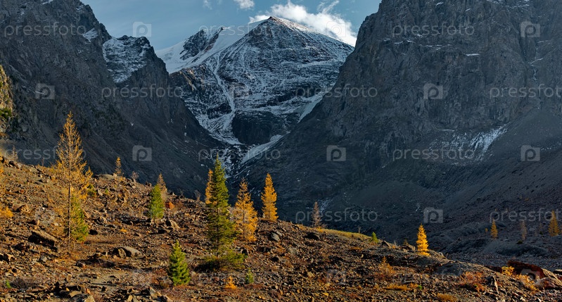 Россия. Юг Западной Сибири, горный Алтай. Контрасты желтых лиственниц на фоне мрачных скалистых гор Актру, покрытых вечными ледниками