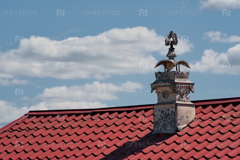 Сергиев Посад, Россия. Июнь 07, 2022. Детали ажурного оформления кирпичной печной трубы на крыше деревенского дома