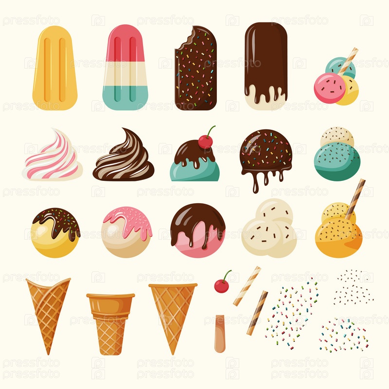 Дизайнер мороженого. Различные вкусы, рожки, начинки и начинки для приготовления мороженого