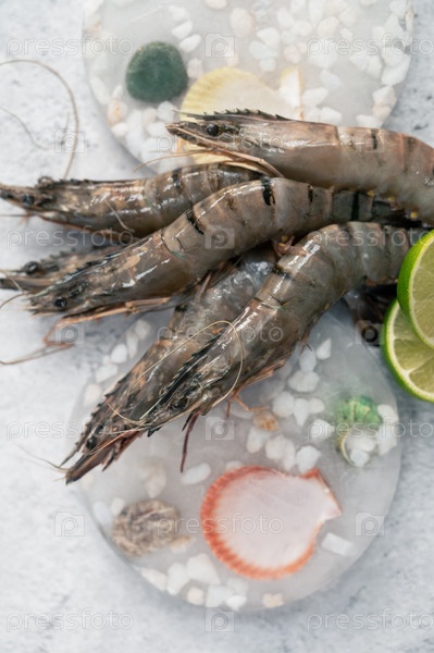 Сырые цельные свежие сырые креветки на украшенном льду с лаймом на фоне серого камня