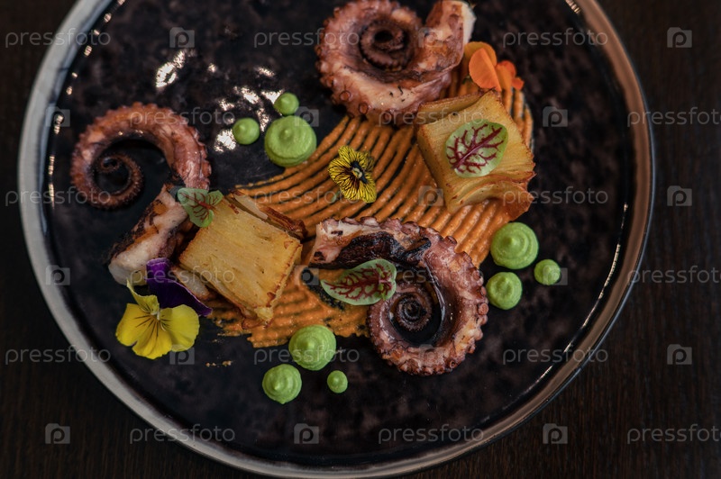 Осьминог с картофелем на гороховом пюре