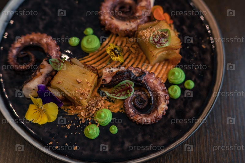 Осьминог с картофелем на гороховом пюре, украшенный съедобными цветами
