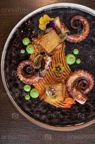 Осьминог с картофелем на гороховом пюре, украшенный съедобными цветами