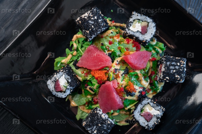 Японская кухня, суши и роллы с салатом из тунца
