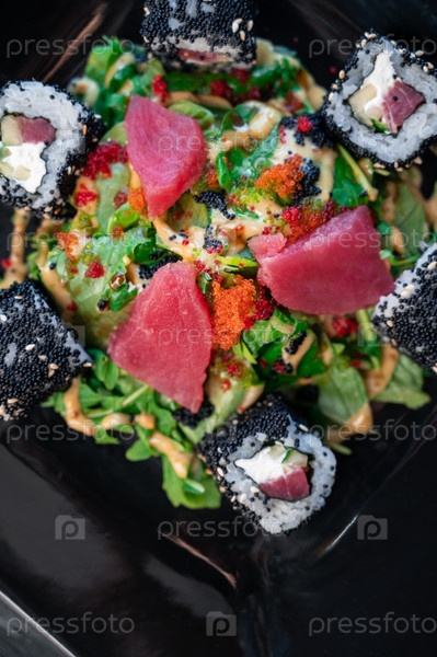 Японская кухня, суши и роллы с салатом из тунца
