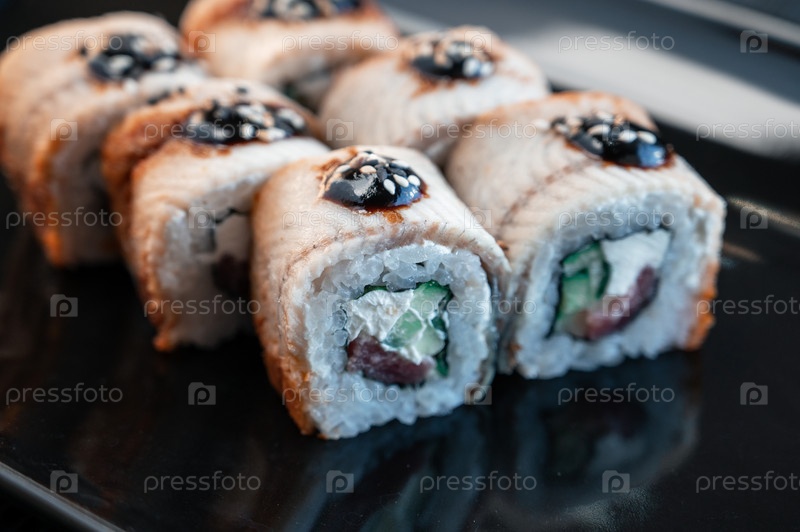 Суши роллы Калифорния с креветками и грецкий орех с горохом. доставка еды. 4K Большой план