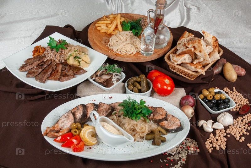 Различные блюда на столе, концепция общественного питания