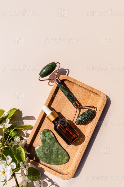 Роликовый нефритовый массажер, скребок Гуа Ша, натуральное массажное масло в бутылке с капельницей на деревянном подносе. Вертикальный вид сверху. Санаторно-курортное лечение. массаж
