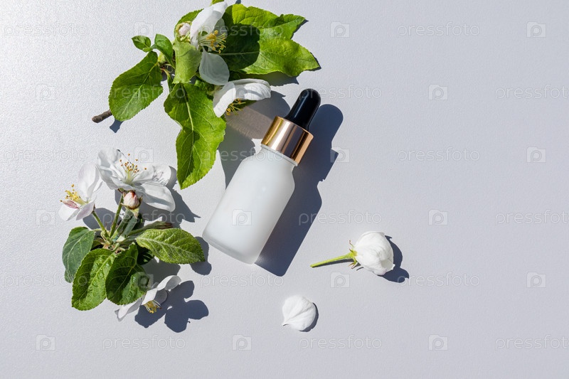 Сыворотка для ухода за сухой кожей лица в матовом флаконе с капельницей на сером фоне, яблоневый цвет, лепестки. вид сверху. макет