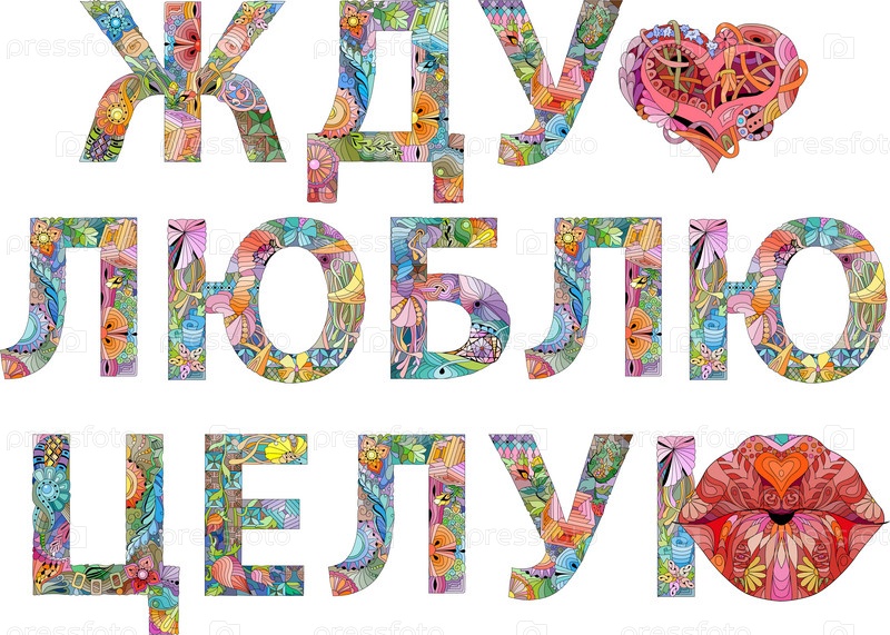 Иллюстративные слова WAITING LOVE KISS на русском языке для дизайна футболок, татуировок и других украшений