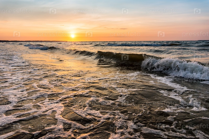 Закат над морем. Отражение солнечного света в морских волнах. Красное и желтое небо в лучах заката
