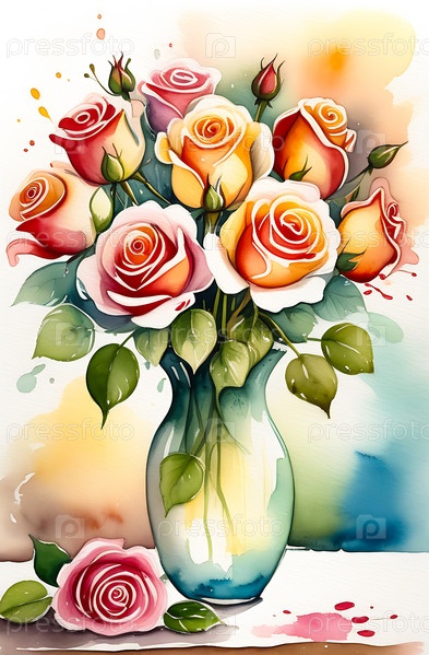 Акварельный рисунок букета роз в вазе на столе