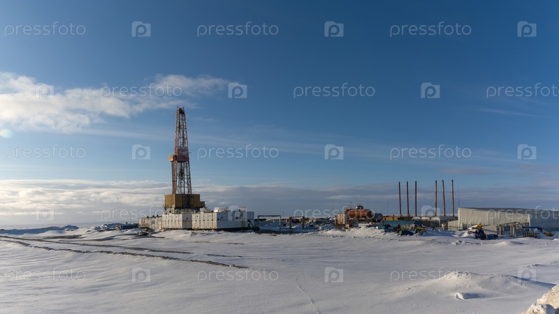 Буровая вышка и инфраструктура бурения скважин на северном нефтегазовом месторождении. Полярная снежная зима. Ясное голубое небо