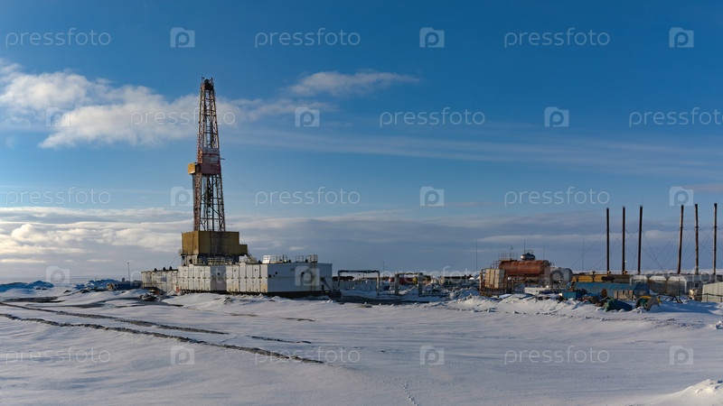 Буровая вышка и инфраструктура бурения скважин на северном нефтегазовом месторождении. Полярная снежная зима. Ясное голубое небо