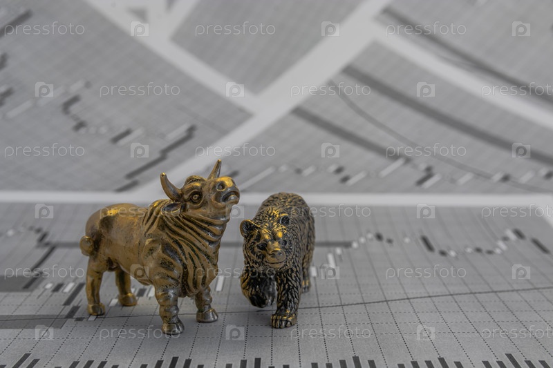Металлические желтые бычьи и медвежьи фигуры на фоне графиков цен на акции. Биржевые торговые символы. Концепция борьбы покупателей и продавцов на валютном рынке и рынке ценных бумаг
