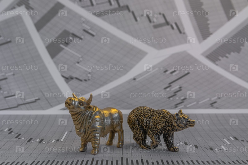 Металлические желтые бычьи и медвежьи фигуры на фоне графиков цен на акции. Биржевые торговые символы. Концепция борьбы покупателей и продавцов на валютном рынке и рынке ценных бумаг