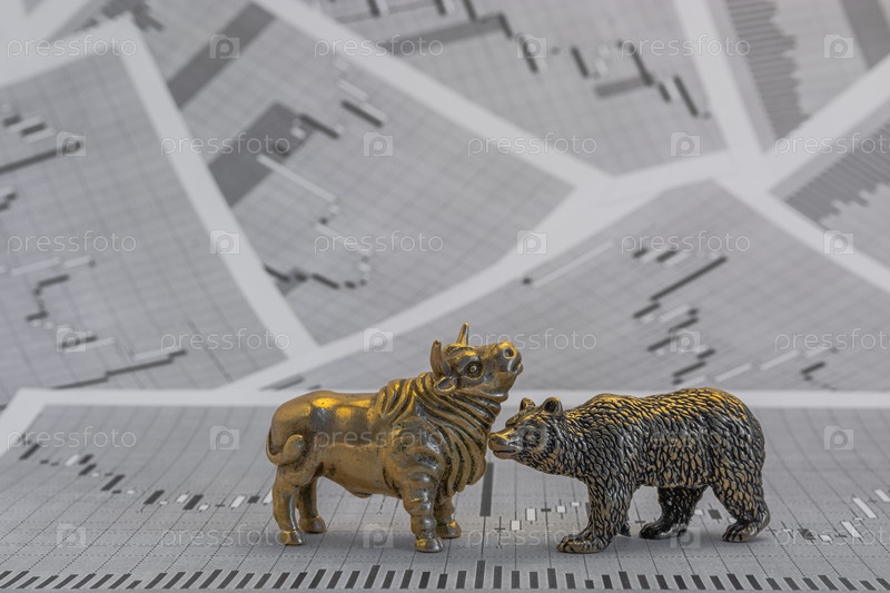 Металлические желтые бычьи и медвежьи фигуры на фоне графиков цен на акции. Биржевые торговые символы. Концепция борьбы покупателей и продавцов на валютном рынке и рынке ценных бумаг