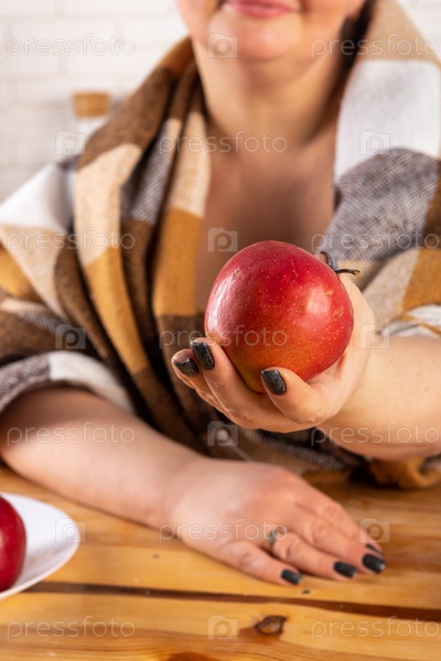 Портрет молодой женщины, улыбающейся и завернутой в уютное одеяло, протягивающей спелое красное яблоко