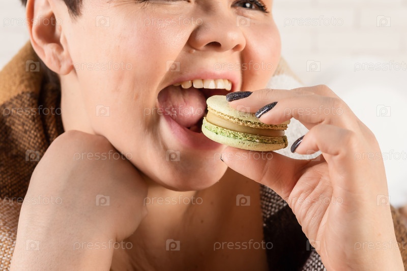 Привлекательная молодая женщина ест вкусное фисташковое миндальное печенье