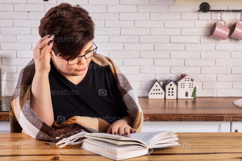 Вдумчивая женщина читает книгу и наслаждается тишиной в уютной кухне