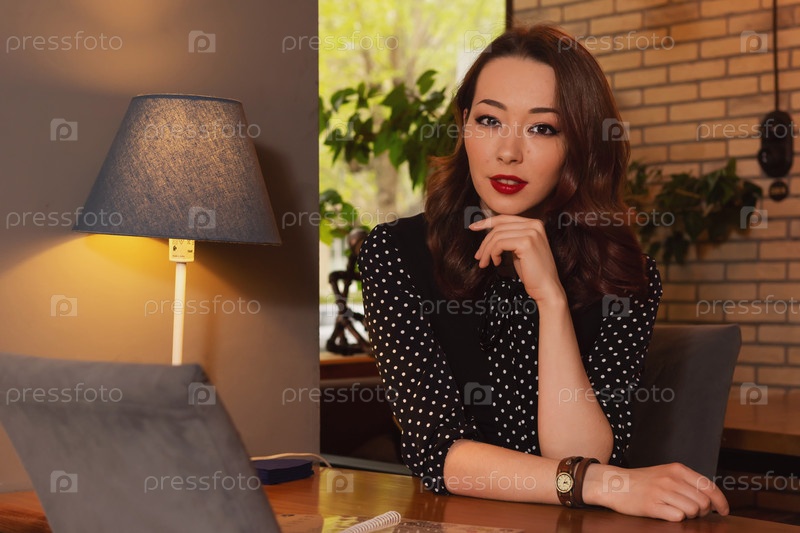 Стильная женщина в черном платье с белыми горошками сидит за столиком в кафе