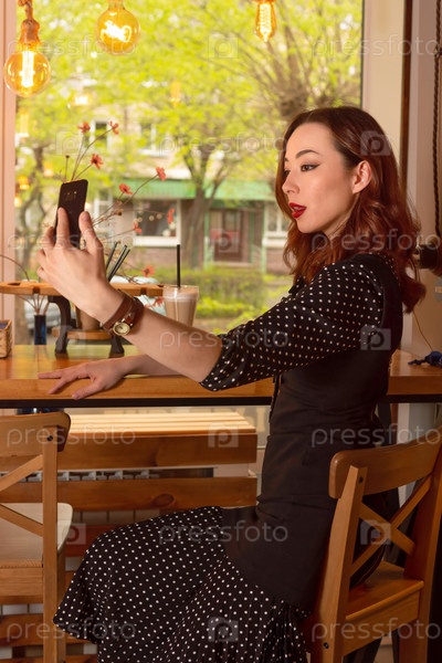 Стильная женщина в винтажном наряде, делающая селфи за уютным столиком в кафе с чашкой кофе