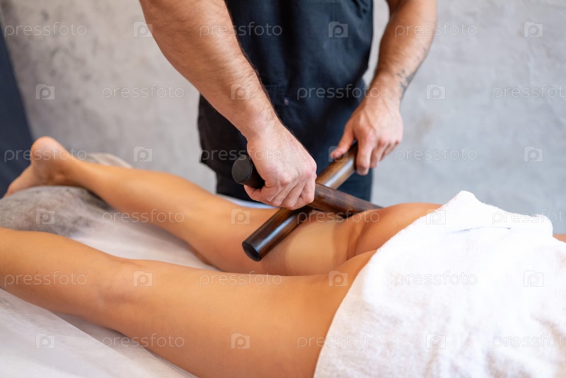 Креольский массаж бамбуковыми палочками на ногах женщины в спа-салоне