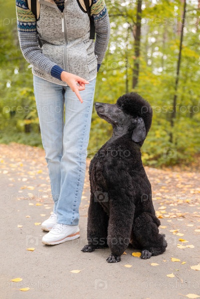 Элегантный черный пудель сидит рядом с ногой женщины в парке на фоне осенних листьев