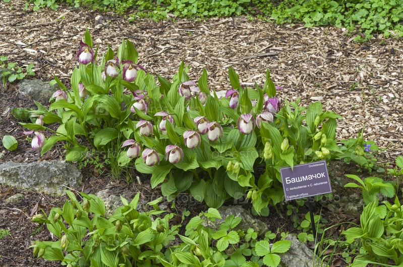 Цветущая орхидея из рода "Башмачок". Аптекарский Огород (филиал ботанического сада МГУ). Москва. Май