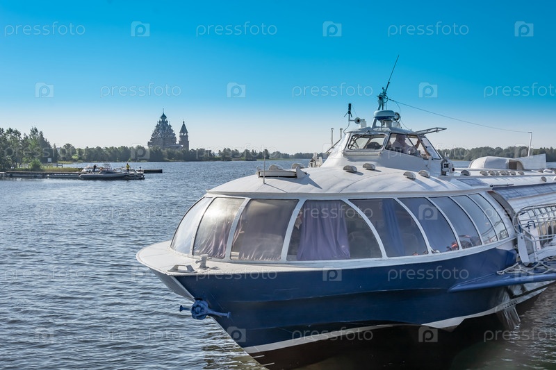 Метеор на подводных крыльях или комета на Онежском озере. Корабль стоит у причала. На заднем плане древняя архитектура острова