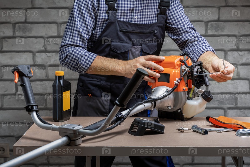 Мужской ремонт бензиновых косилок. Механик работает, ремонтирует триммер
