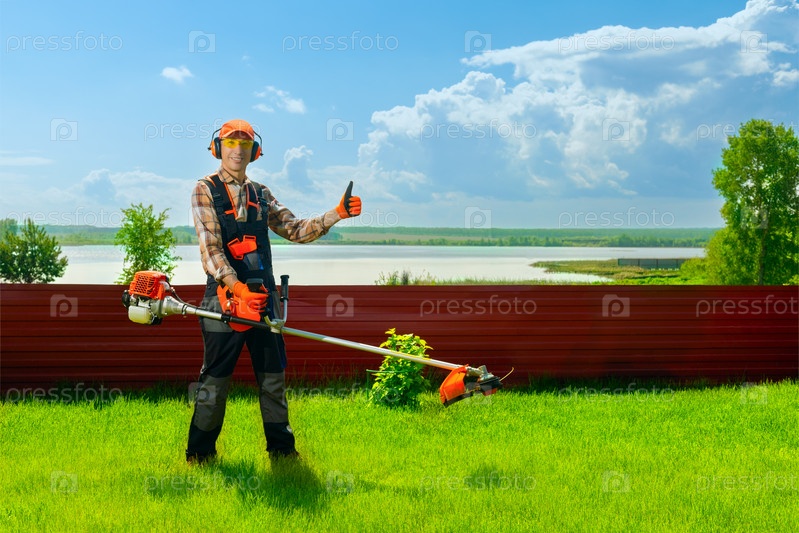 Портрет счастливого садовника-работника с бензиновым триммером, показывающего большой палец вверх