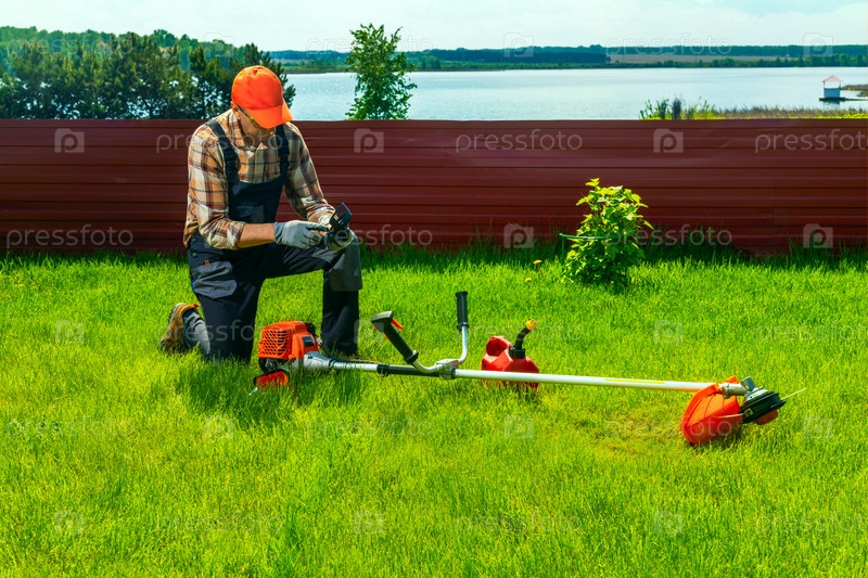 Мужчина ремонтирует бензиновую косилку, проверяет триммер на газоне. ремонт бензинового триммера, ремонт техники для сада
