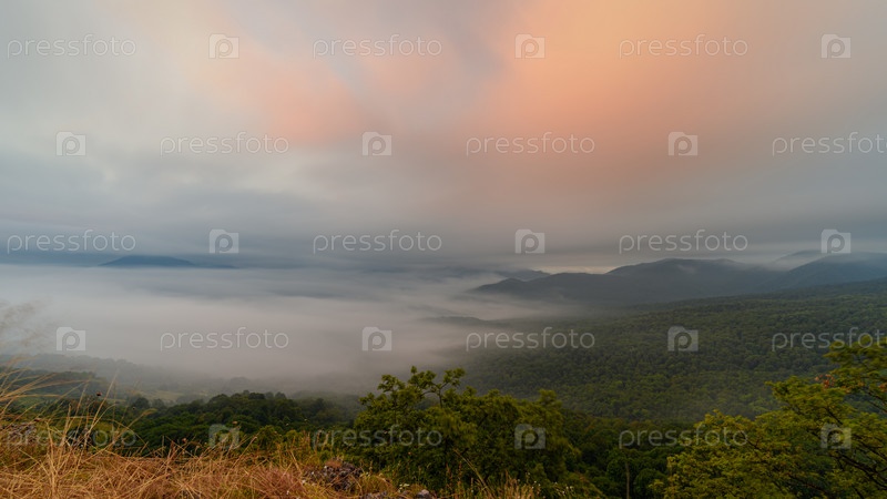 Цветные облака над туманной горной долиной перед восходом солнца