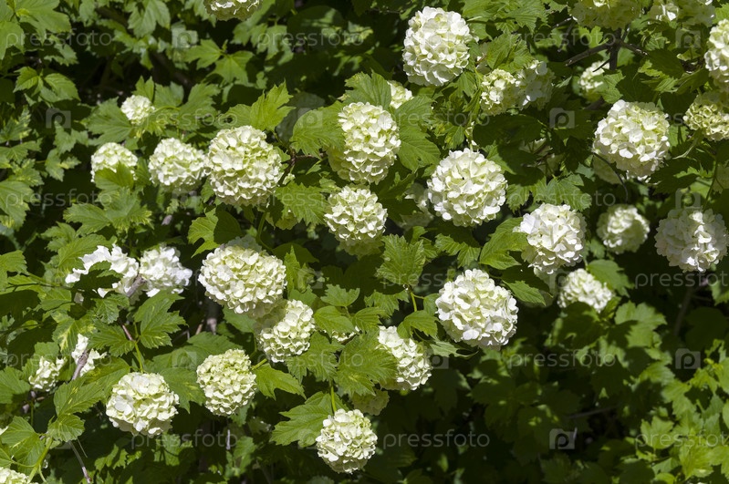 Цветущая декоративная калина (сорт бульденеж). Солнечный день в конце мая